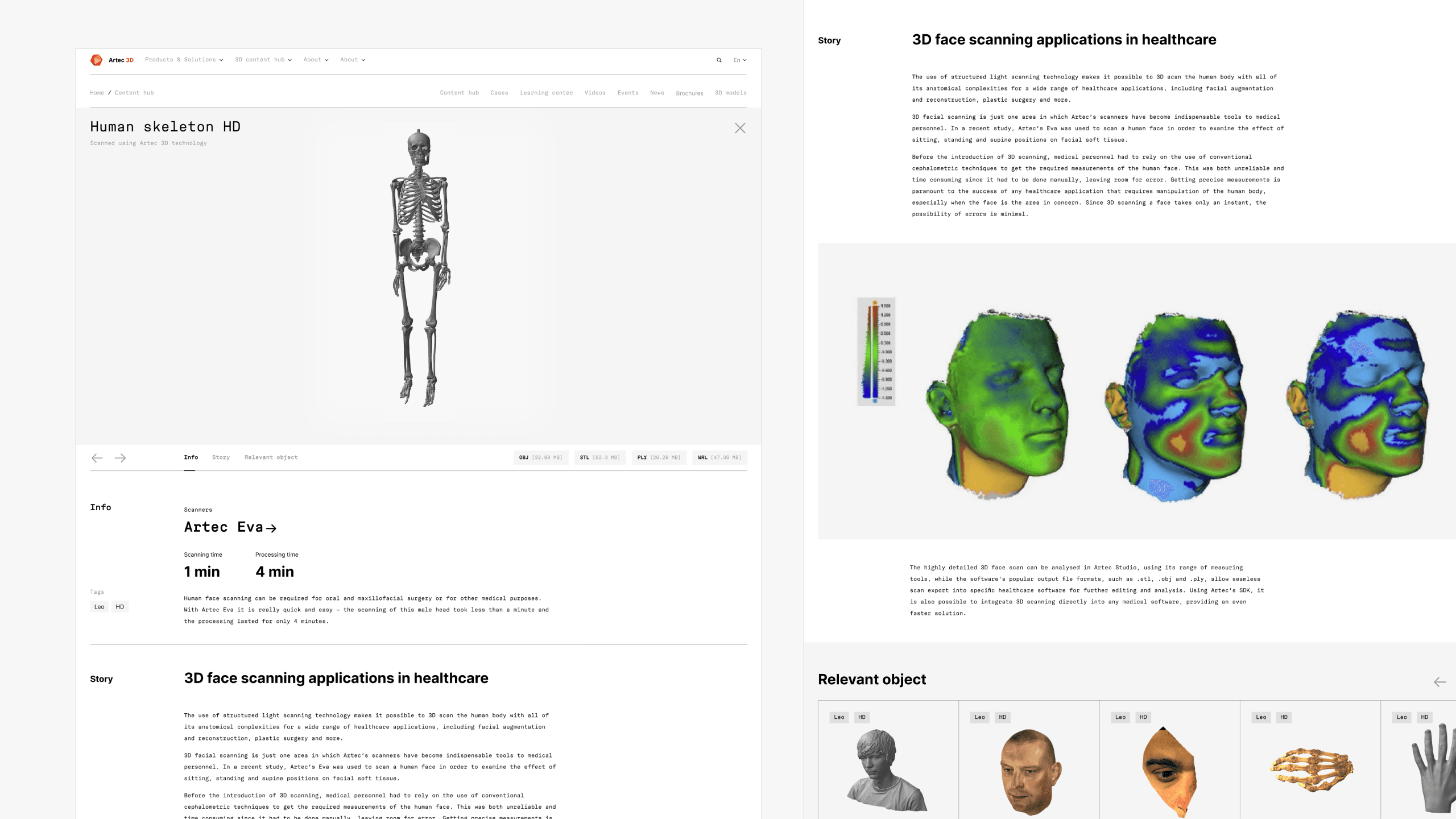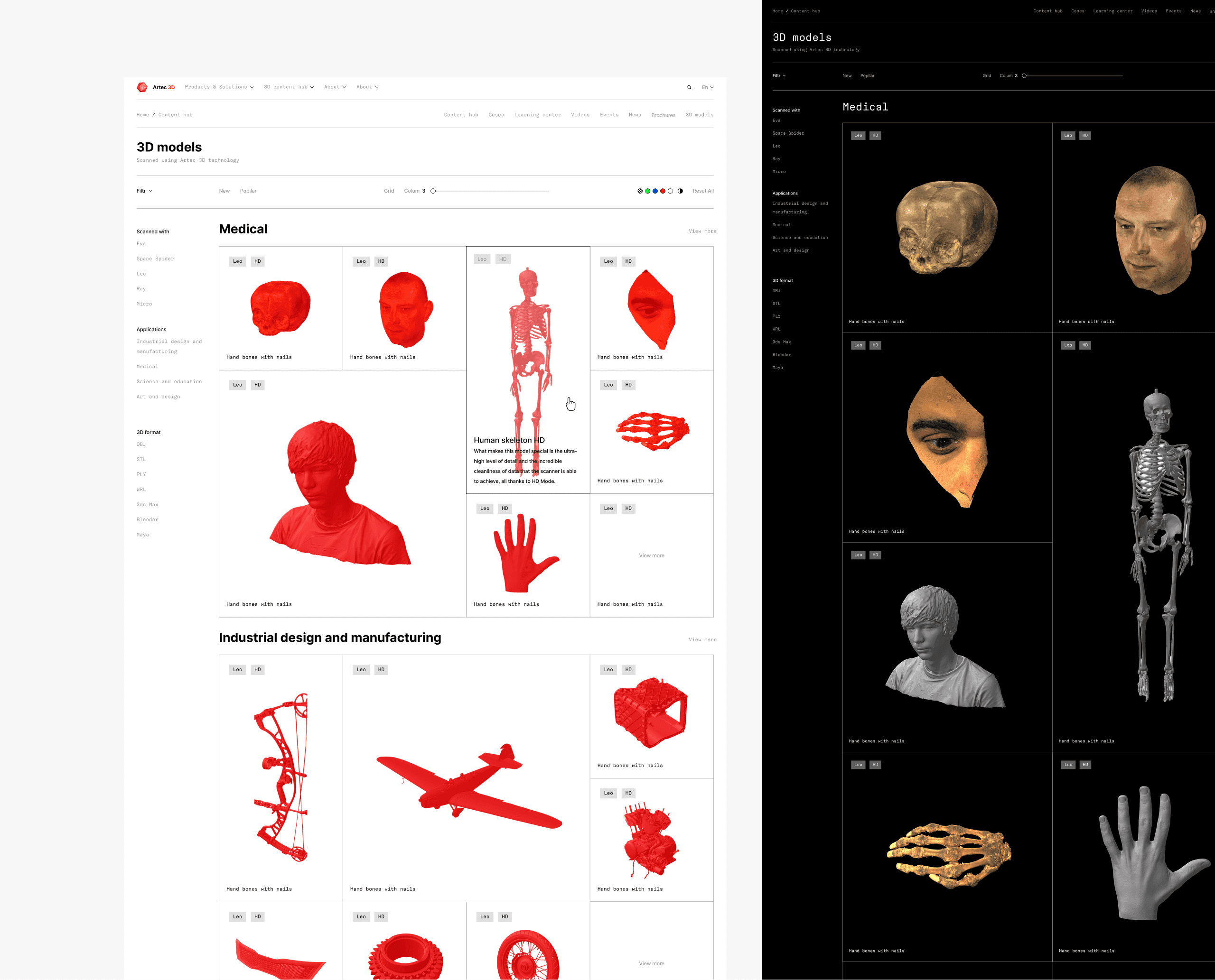 A website featuring a catalog of 3D models created using a 3D scanner. Its goal is to interactively and engagingly showcase the scanner’s capabilities, allowing users to quickly assess the quality of the 3D models produced through scanning. The catalog includes a wide variety of objects, such as complex engineering mechanisms, museum artifacts, works of art, and human body parts for medical research. I suggested adding the ability to explore these models with different textures applied, under various lighting conditions, and against diverse backgrounds to enhance the user experience.