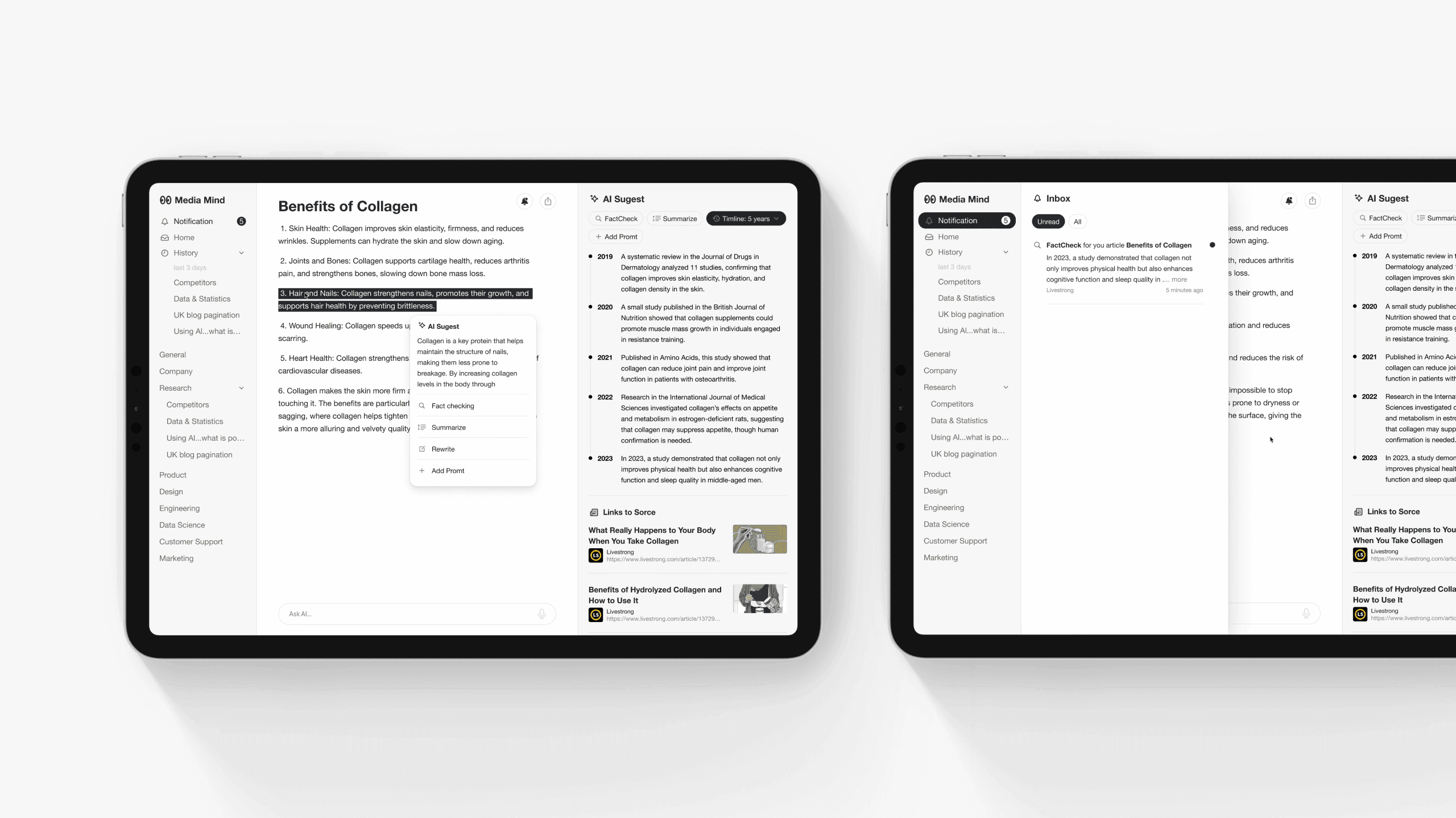 I came up with a tool for working with textual information, writing articles based on approved scientific publications, fact-checking, discovering information, and tracking new publications. My idea is to combine the ability to interact with an AI model in a conversational dialogue format with the option to write text independently. The tool allows users to get contextual suggestions or assistance from the AI model in a second-screen mode, or activates when they select any fragment of text.